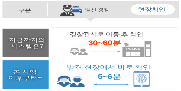이전에는 치매 노인, 주취자 등의 구호대상자를 발견하면 신원확인을 위해 고정식 신원확인 시스템이 비치된 인근 지구대나 파출소까지 이동해야 함에 따라 대상자의 인적사항을 확인하는데 최소 30분에서 1시간이나 소요되었습니다.