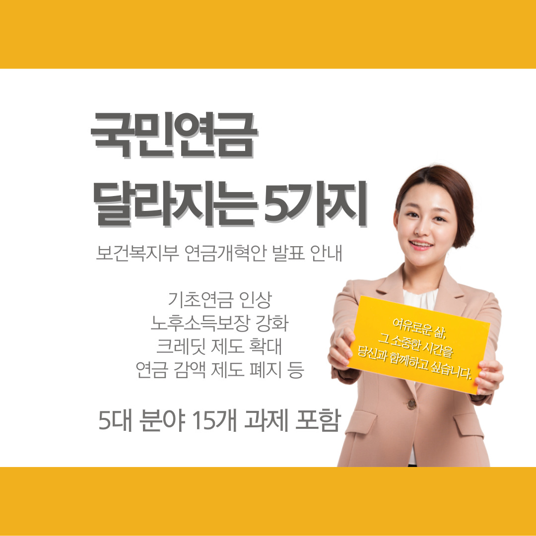 요즘 사회적으로 계속 문제 되고 있는 근본적인 저출산과 고령화 문제가 가장 심각하다고 하고 있습니다. 이로 인해 국민연금 기금이 고갈 위기에 놓이게 되었고 정부도 3대 사회개혁 과제 중의 하나로 '연금개혁'을 추진하고 있습니다. 이번에 보건복지부 장관이 직접 연금개혁안을 발표했는데 기족 9%였던 보험료율을 어떻게 하겠다고 말한 게 아니라 공론화를 통해 구체화하고 논의해 나가겠다고 애매하게 정확한 수치는 빼고 발표를 했습니다. 하지만 기초연금 인상, 노후소득보장 강화, 크레딧 제도 확대, 연금 감액 제도 폐지 등 5대 분야 15개 과제를 공론화했습니다. 현재 연금을 받고 계신 노인분들과 곧 받게 될 중년뿐만 아니라 국 복무 중인 청년, 출산과 관련된 혜택까지 포함되어 있고, 나이대별로 차등해서 보험료를 다르게 인상한다고 하니 모든 국민이 관심을 가질 수밖에 없는 문제인 것 같습니다. 앞으로 달라지는 노령연금과 기초연금 등 최근 발표된 연금개혁 방안을 쉽게 설명해 보도록 하겠습니다.