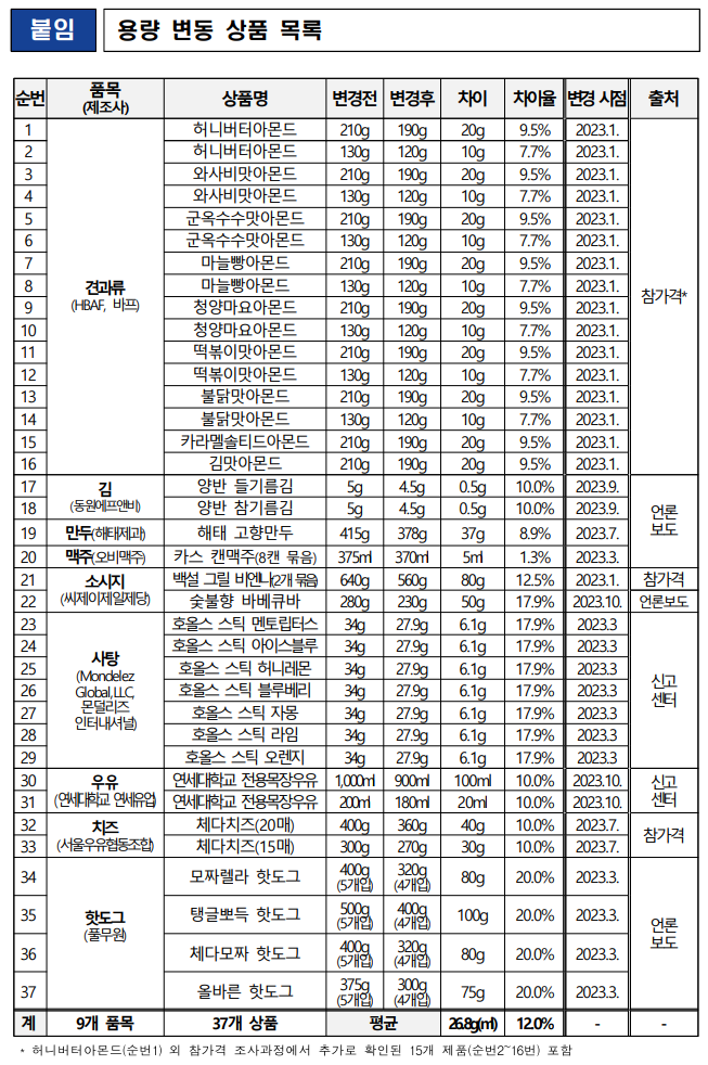 한국소비자원에서 슈링크플레이션 식품을 조사 결과 발표 (글 아래 제품 리스트)