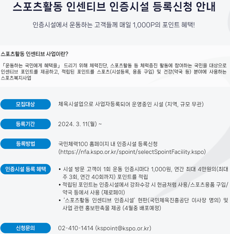 평소에 내가 운동하러 다니는 곳을 스포츠활동 인센티브를 받을 수 있는 [스포츠활동 인증시설]로 등록하면 됩니다. 아무나 등록할 수 있는 건 아니지만, 시설 담당자가 간단히 신청하면 됩니다. 국민체력 100 홈페이지에서 현재 인증시설을 모집하고 있습니다. 인증시설이 됐다고 직접적으로 특별한 혜택을 지원하는 건 아니지만 신청할 때 돈이 들어가는 것도 아닙니다. 시설을 이용하는 회원들이 1회당 천 원씩 4만 원까지 인센티브를 받을 수 있으니 스포츠와 관련된 사업장을 운영하시는 분들이라면 신청하시는 것이 좋겠습니다.