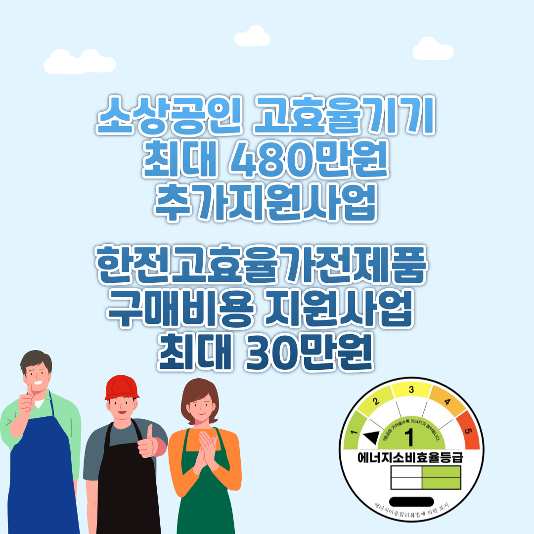 소상공인 고효율기기 정부 추가지원 최대 480만원 / 한전 고효율가전제품 구매비용 지원사업 최대 30만원 / 3월에 신청하는 정부지원금