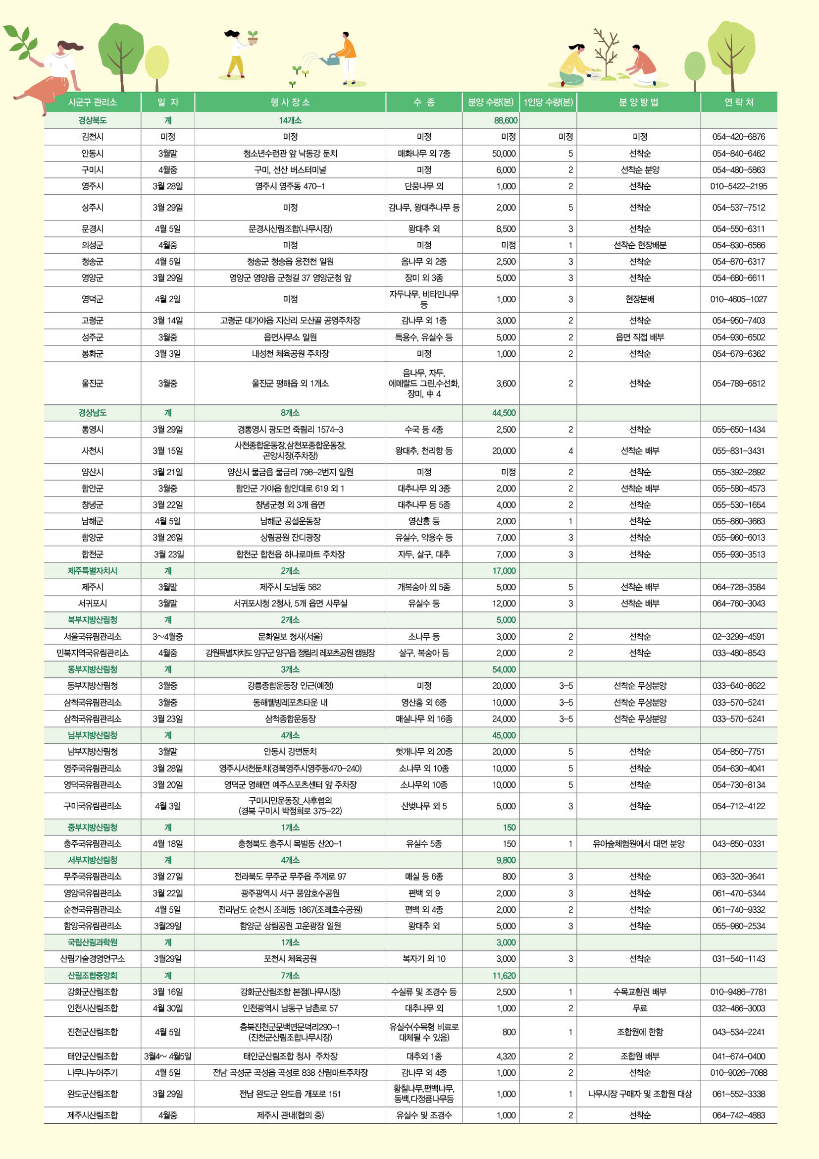 안동시와 김천시를 예로 들어보면 지역별로 행사 일자와 분양하는 수종이 다르고 1인당 분양받을 수 있는 수량도 다른 걸 확인할 수 있습니다. 위 이미지 표에 보시면 해당 지역 담당자 전화번호도 나와있습니다. 미리 전화하셔서 정확한 시간과 장소 확인하시고 방문하셔서 원하시는 나무 받아가시길 바랍니다.