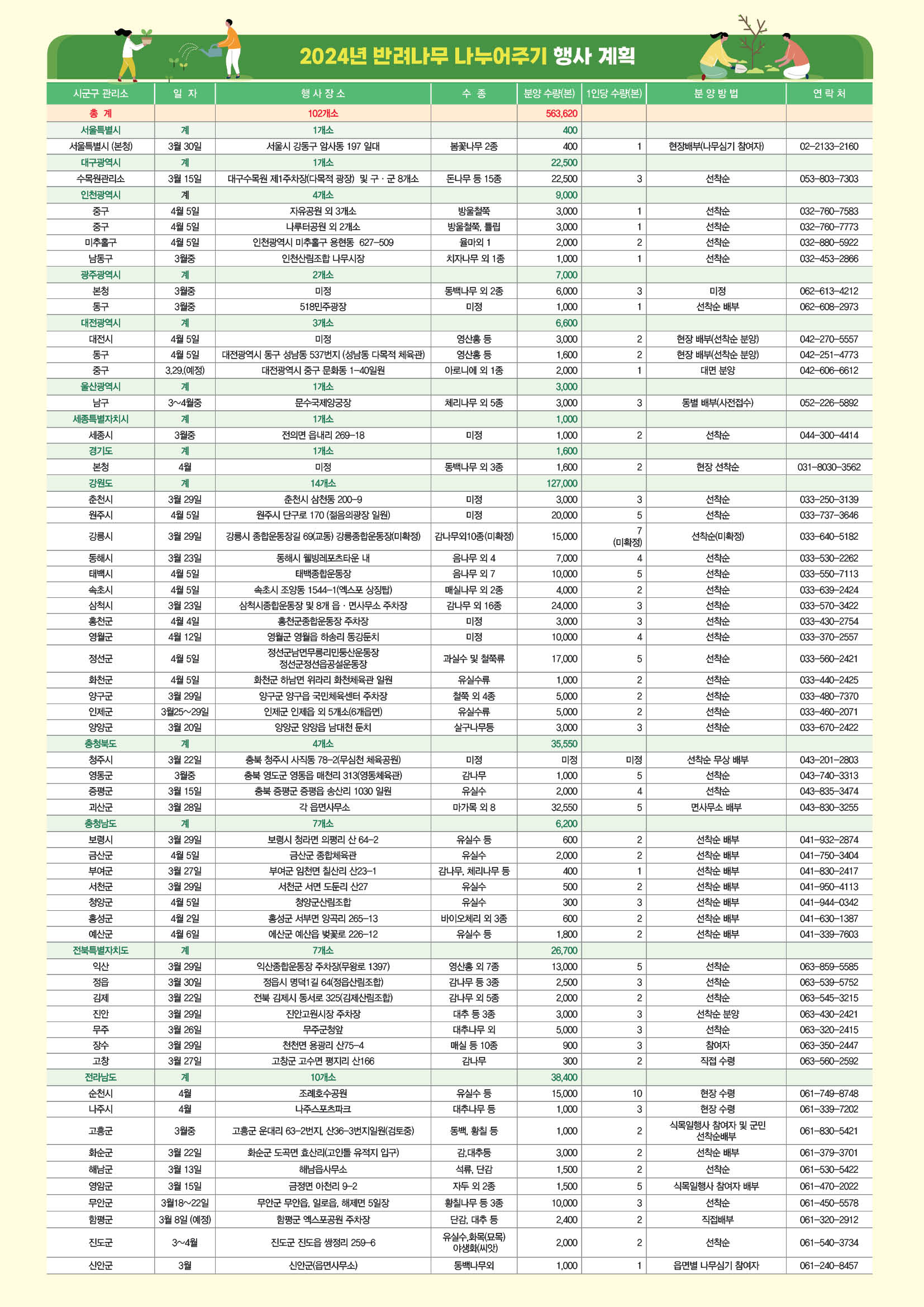 해마다 식목일 전후로 나무 묘목을 무료로 나눠주는 행사를 산림청에서 전국적으로 진행합니다. 24년에는 전국 102곳에서 56만 그루를 선착순으로 무료로 나눠줍니다. 매년 아는 분들만 받는 제도입니다. 지역별로 날짜가 다르고 나무의 종류도 다릅니다. 작년에는 비대면 쿠폰 형식으로 지급했지만 올해는 전국적으로 [반려나무 나누어주기] 이름으로 각 기관별 행사 장소에서 선착순으로 나눠주고 나무 심기 체험 등 저렴한 가격으로 판매하는 나무 시장도 운영합니다.
