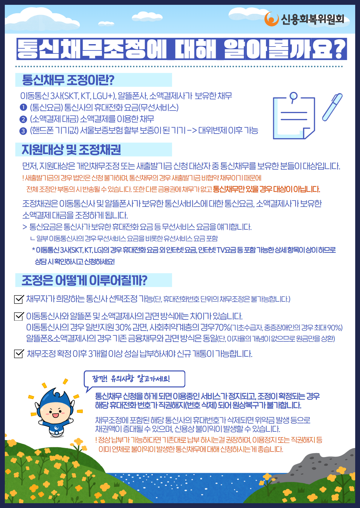 단, 채무 조정을 지원받은 이후 3개월 이상 상환액을 납부하지 못하면 채무 조정 효력이 취소되어 원래의 상환의무가 다시 발생합니다. 통신 채무는 3개월 이상 성실하게 납부할 경우 완납하기 전이라도 통신 서비스를 이용할 수 있게 됩니다. 채무 조정 중에도 핸드폰을 사용할 수 있게 하여 경제활동이 원활하게 도움을 주고자 하는 취지입니다.