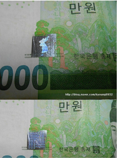 현금을 사용하시는 분들은 위조지폐 분별법을 알고 계셔야겠습니다. 위조지폐를 구분할 때는 지폐를 빛에 비추어보면 나오는 숨은 그림이 있으니 확인하셔야 하며, 홀로그램 또한 확인하셔야 합니다. 만 원짜리 지폐의 경우는 빛에 비추면 숨은 그림으로 세종대왕의 인물 초상 모습과 시선 방향에 따라 다르게 나타납니다.