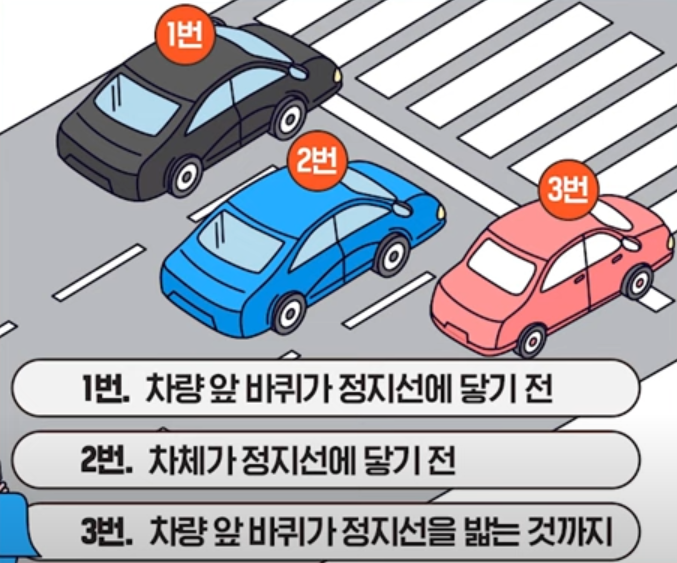 위 그림 1번, 2번, 3번 중에 어떤 것이 맞을까요? 지금까지는 정지선 단속이 그렇게 많지 않았기 때문에 운전자들도 여기에 대한 정확한 기준이 어디인지 관심이 별로 없었던 것도 사실입니다. 하지만 이제부터 더욱더 단속이 강화되고 있습니다. 과태료와 범칙금도 나오기 때문에 정지선 기준이 [차량의 앞 범퍼 끝]입니다. 즉, 차량의 앞 범퍼가 정지선에 걸리지 않도록 정확하게 정지해 주셔야 합니다.