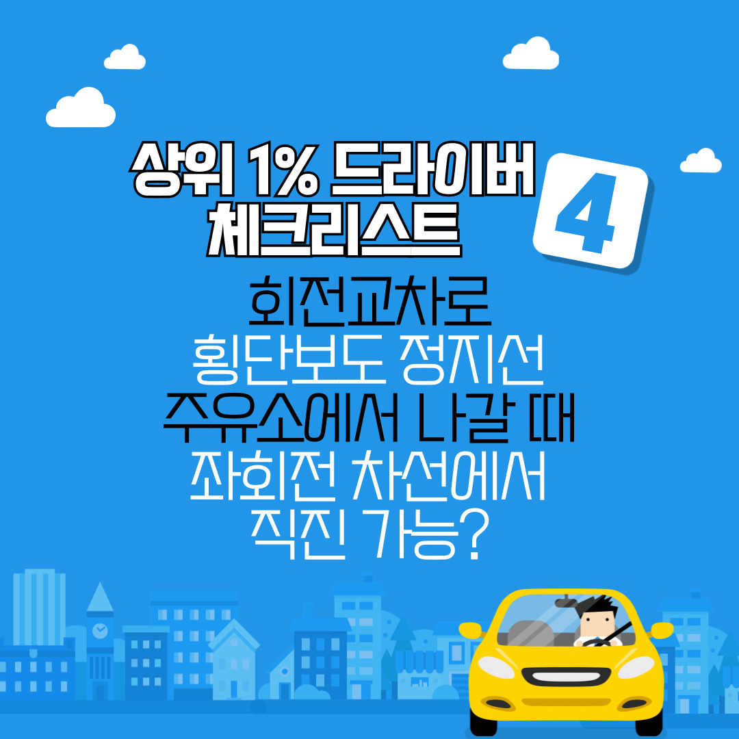 이 4가지 다 알면 당신은 상위 1% 베테랑 운전자!! / 회전 교차로 사용법 / 횡단보도 정지선 원칙 / 주유소 나갈 때 깜박이 어느쪽? / 좌회전 차선에서 직진 가능할 때?