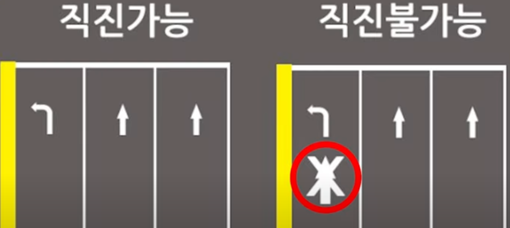 일단 개념은 직진 금지 표시가 없어야 직진이 가능하다는 것입니다. 또한 진행방향으로 차선이 이어져 있을 때만 직진이 가능합니다. 이 두 가지 꼭 기억하시길 바랍니다.