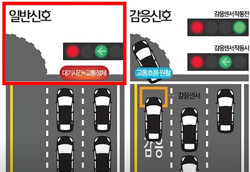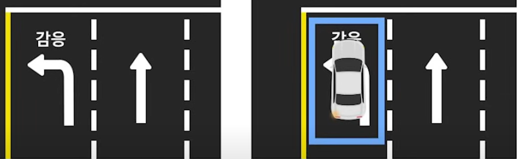 가장 중요한 것은 차가 파란색 라인 안에 완전히 들어갔을 때 센서가 자동차를 인식하는데 여기에 차가 들어오게 되면 센서가 [좌회전하는 차가 들어왔다]라고 판단하고 좌회전 신호가 점등되는 방식입니다.