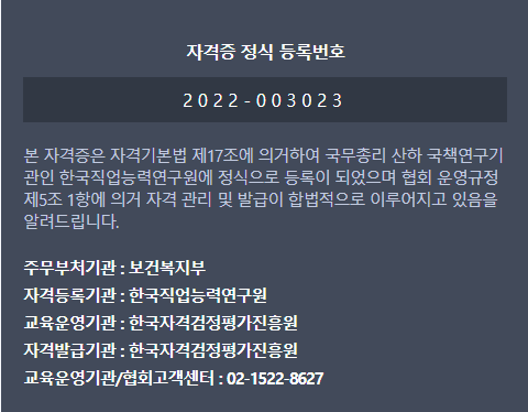 이 자격증이 꼭 필요하고 일해보고 싶다고 생각하고 계신다면 9만원 정도의 자격증 발급비용을 받기 때문에 당장 꼭 필요하지 않으신 분들은 자격증을 실물로 발급받을 필요가 없습니다. 합격하신 후 자격증 등록번호를 발급받게 되시는데 여기서 선택사항에 자격증을 발급을 받으실지 선택하시면 됩니다.