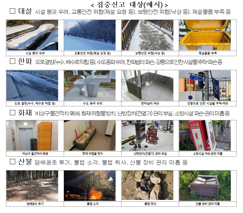 행정안전부는 겨울철 재난과 안전사고 예방을 위해 12월 8일부터 내년 2월 29일까지를 '겨울철 재난. 안전 위험요인 집중신고 기간'으로 정하고, 안전신문고를 통해 적극 신고해 줄 것을 당부했습니다.