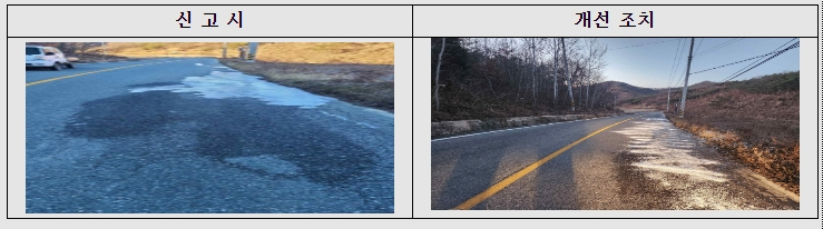 작년 12월 초, 안전신문고를 통해 A지역의 커브길이 얼어 교통에 문제가 있는 것으로 보인다는 내용의 신고가 접수되었다. 해당 신고내용은 소관기관으로 즉시 전달되어 현장 안전점검이 이루어졌고 제설제 살포 등 개선조치가 이루어졌다.