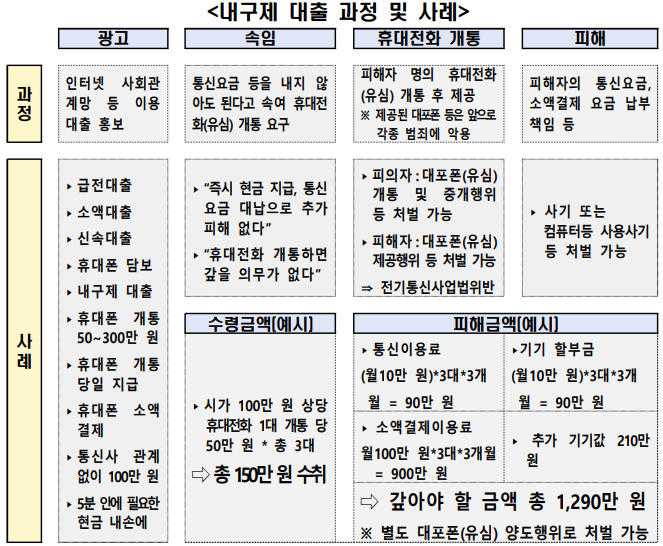 내구제 대출이란, 나를 스스로 구제하는 대출이라는 뜻으로 급하게 돈이 필요하지만 대출이 가능하지 않은 사람이 휴대전화를 개통해 대부업자에게 넘기고 그 일부를 현금으로 대신 받는 행위의 사기수법입니다. 이런 것을 사람들은 [휴대전화깡]이라고 부릅니다.