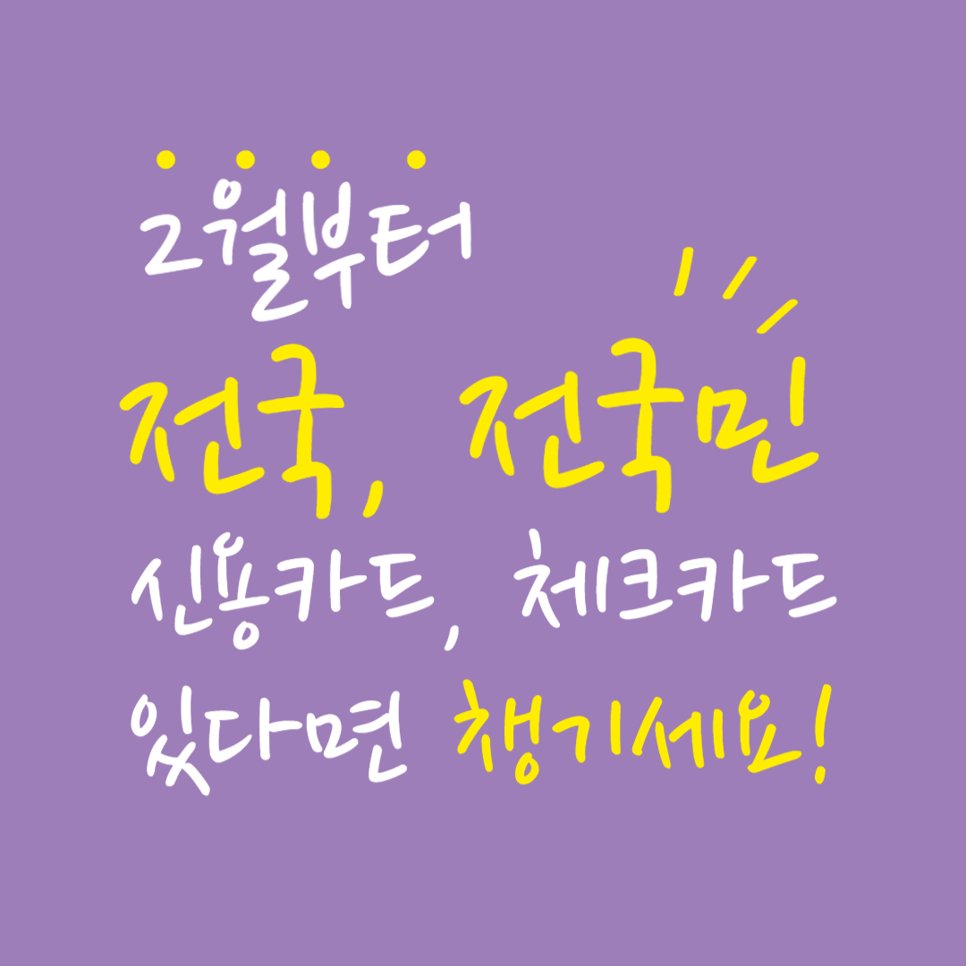 위의 9개 카드사 중에 신용카드나 체크카드 중 하나만 있다면, 나이 소득 지역 무관하게 전 국민 누구나 혜택 받을 수 있습니다. 이번 2월, 3월부터 새롭게 시작하는 좋은 혜택이니 모두 잘 활용하시면 좋겠습니다.