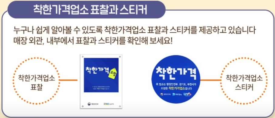 위의 각종 정부 시책을 잘 이행하고 있는 업소들을 심사해서 선발합니다. 지자체별로 착한 가격업소 표찰과 스티커를 달아줍니다. 지자체별로 쓰레기봉투나 주방세제 등의 인센티브를 제공해 준다거나 상하수도 요금 감면 등의 세제 혜택도 지원합니다.