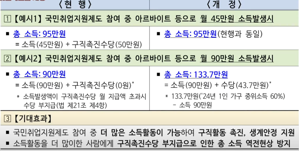 국민취업지원제도에 적용되면서 매월 50만원씩 6개월 동안 지급되는 구직촉진수당이 변경됩니다. 국민취업지원제도는 국민 누구나 취업을 원한다면 취업지원서비스를 종합적으로 제공해 주고, 조건이 충족된다면 생계비도 지원해 주는 제도입니다. 그중에서 1 유형에 해당하는 분들은 구직촉진수당으로 6개월 동안 월 50만 원이 지급되고, 추가로 부양가족 1인당 10만 원씩, 월 최대 40만 원을 추가로 지원받을 수 있어서 최대 월 90만 원까지도 받을 수 있는 제도입니다. 물론 취업을 위한 활동을 해야 합니다. 취업활동을 하면서도 일부 알바를 하는 분들도 계십니다. 그동안에는 구직촉진수당보다 더 많은 소득이 발생하면 수당지급이 아예 안 됐지만, 2월 9일부터는 1인 가구 중위소득의 60%, 올해 기준으로 133만 7천 원을 초과하지 않는다면 구직촉진수당을 중목으로 받을 수 있게 됩니다. 단, 소득에 따라 조금 감액해서 지급됩니다.