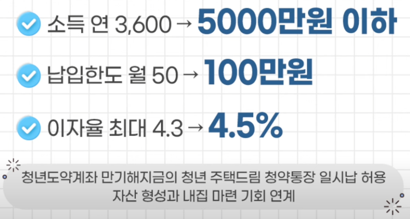 청년들에게 해당하는 청년 주택드림 청약통장이 2월에 출시됩니다. 기존에 청년 우대형 청약통장에 비해 가입조건은 소득 3,600만원에서 5천만 원으로 무주택 세대주에서 무주택자로 완화되고, 이자율은 최대 4.5%로, 납입한도는 최대 100만 원으로 상향됩니다.