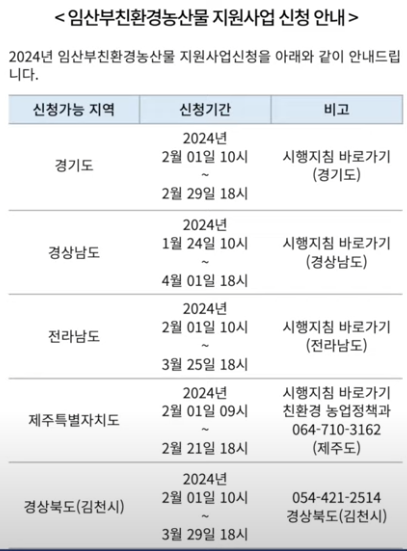2월 1일부터 임산부 친환경 농산물꾸러미 지원사업 신청이 시작됩니다. 올해부터 국비에는 반영되지 않기 때문에 지자체별로 지원이 안 되는 곳도 있고, 선착순이 아니라 올해부터 추천제로 진행됩니다. 2월 1일부터 신청이 시작되는 지역은 경기도, 경상남도, 전라남도, 제주특별자치도, 경상북도 김천시입니다.