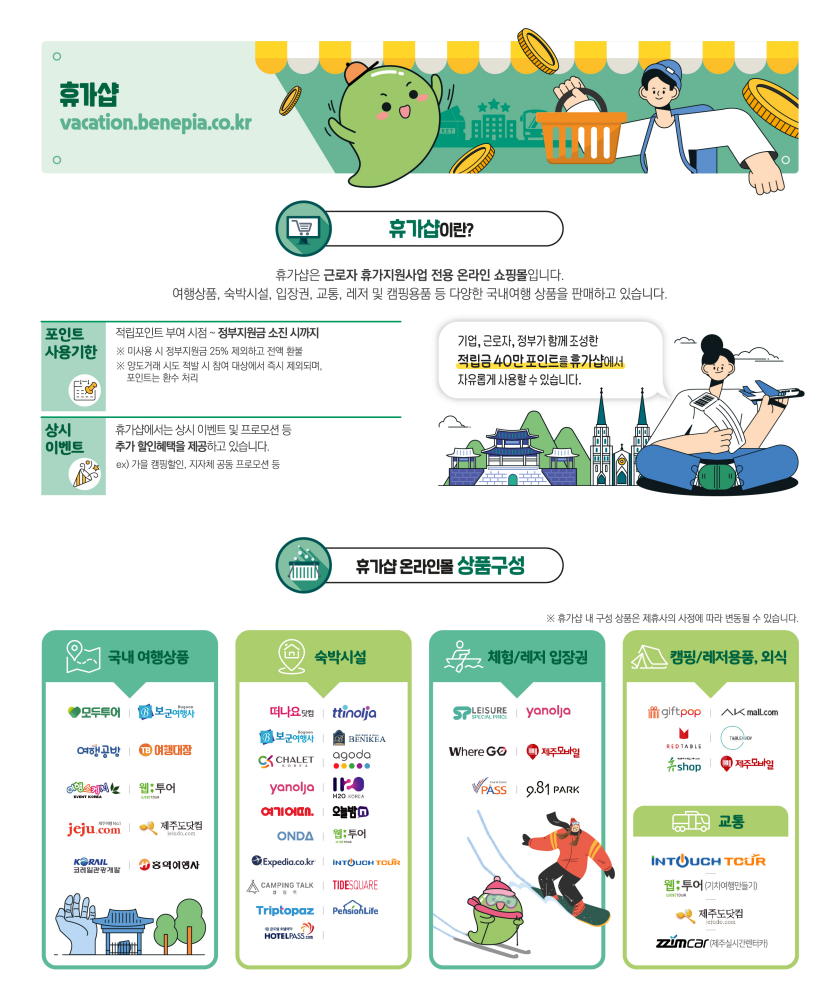 이렇게 40만 원이 생기면 '휴가샵'이라는 홈페이지나, 스마트폰 앱으로 여행과 관련된 상품을 구입하는 데 사용할 수 있습니다. 숙박시설 예약이나, 관광지, 테마파크 입장권 구매, 전시회나 공연 예약, 교통편 예약을 비롯해서 레저용품 구매나 책을 구매하는 데까지 다양하게 사용할 수 있습니다.