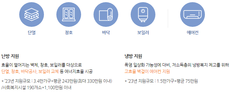 취약계층에 대해 연료비를 지원하는데 단열, 창호, 바닥공사 및 보일러, 에어컨 설치를 통한 주택 에너지 효율을 개선하는 정부지원 사업입니다. 이번에는 1,057억원 지원규모입니다. 작년에 지원을 받았다면 올해는 해당이 되지 않습니다만 계속해서 저소득층에 대한 지원사업을 늘려가고 있습니다. 늦게 신청하게 되면 예산이 부족해서 지원받지 못하는 분들도 생깁니다. 우선 자격대상이 되시거나 주민센터에 내가 자격이 되는지 문의해 보셔서 빨리 신청하시는 것이 좋겠습니다.