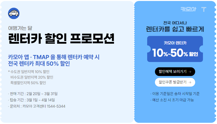 수도권은 최대 만원까지 10%, 비수도권은 2만 원까지 20%, 특별 할인 지역은 5만 원까지 50%가 할인됩니다. 카모아라는 렌터카 회사에서 예약하시면 됩니다. 50%가 적용되는 특별 할인 지역은 인구감소 지역으로 정해졌습니다. 충북 제천, 강원도 고성, 전남 보성, 경북 봉화가 해당됩니다.