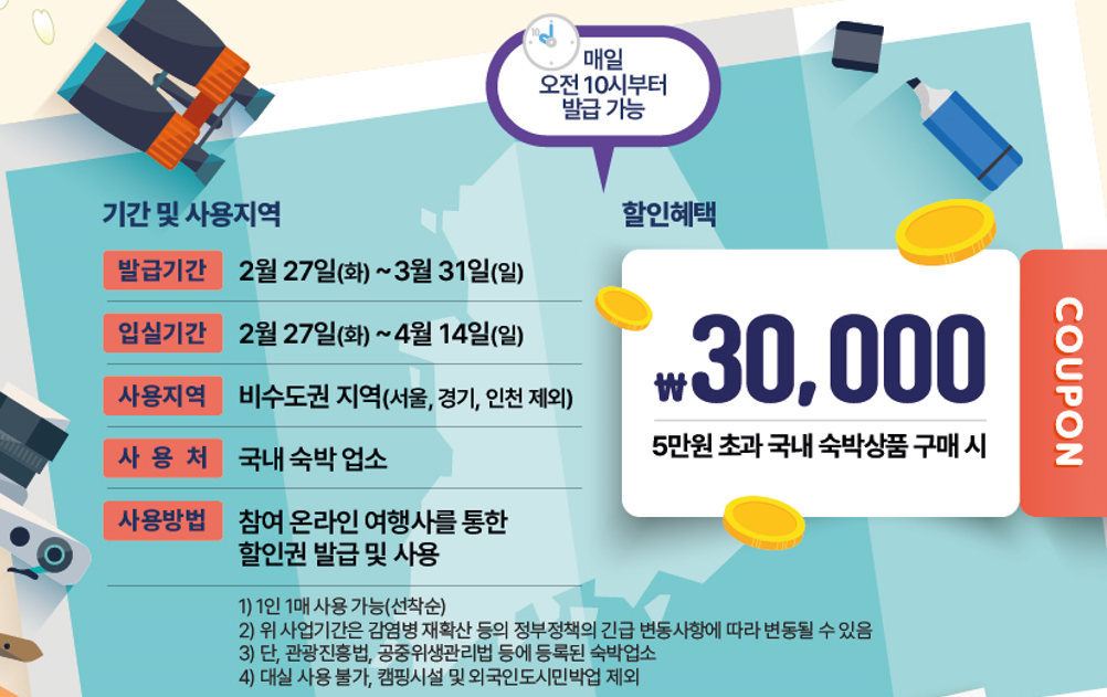 2월 27일부터 매일 오전 10시에 3만원 숙박 할인권 배포