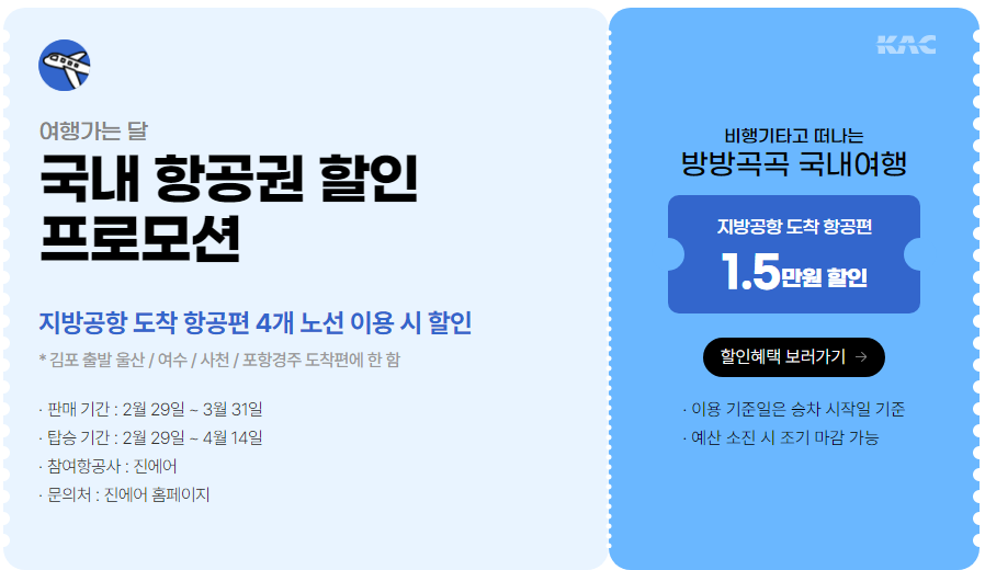 아쉽지만 제주와 부산같이 인기가 많은 공항은 제외되며, 김포에서 울산, 여수, 사천, 포항. 경주 공항만 해당합니다. 진에어 항공편으로 편도만 할인되며 2월 29일~3월 31일까지 판매하고, 탑승 기간은 2월 29일부터 4월 14일까지 가능합니다.