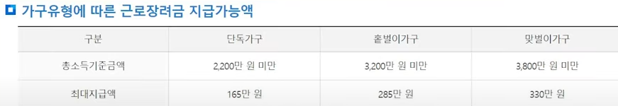 일은 하지만 소득이 적어 생활이 어려운 근로자, 사업자(전문직 제외) 가구에 대하여 가구원 구성과 근로소득, 사업소득 또는 종교인소득에 따라 산정된 근로장려금을 지급함으로써 근로를 장려하고 실질소득을 지원하는 근로연계형 소득지원 제도입니다. 근로장려금은 가구원 구성에 따라 정한 부부합산 총 급여액 등을 기준으로 지급액을 산정합니다.
