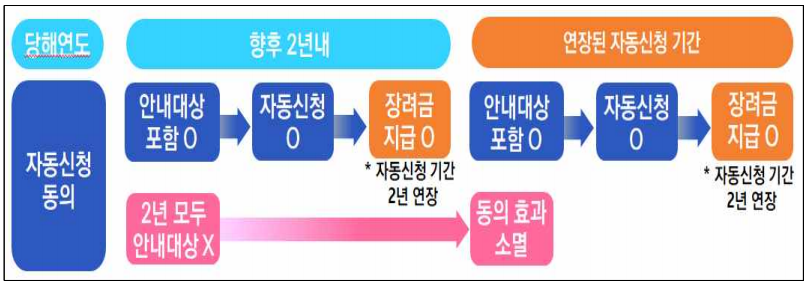 - (동의 효과) 장려금 신청 대상인 고령자 등이 자동 신청에 동의한 경우 향후 2년 내 신청 대상에 포함되면, 별도의 장려금 신청 불필요