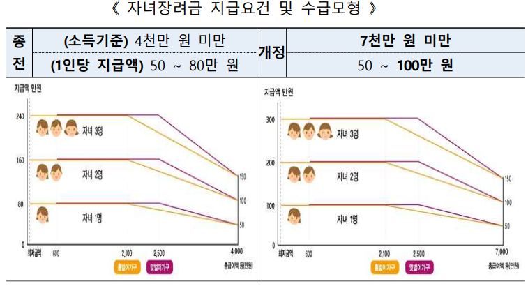 ① 장녀장려금 제도 확대 : (소득기준) 4천만 원 → 7천만 원 미만, (최대지급액) 80만 원 → 100만 원 (약 47만 가구 ↑ )