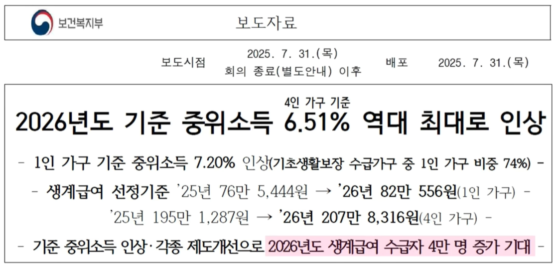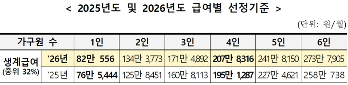 생계급여, 주거급여, 교육급여 금액이 인상됩니다. 2026년 기준 생계급여 최대 금액은 아래 표와 같습니다.