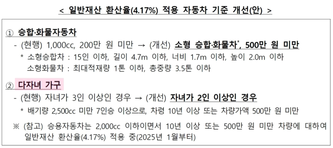 수급자가 다자녀가구이면 자동차 재산은 완화해서 봅니다. 지금은 다자녀 기준이 자녀 3명 이상이지만, 내년부터는 이 기준이 2명 이상으로 완화됩니다.