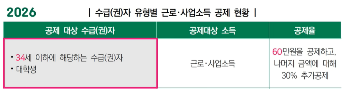 예를 들어서 34세 청년이 100만원을 벌면 60만 원을 빼고 남은 40만 원의 70%인 28만 원만 소득으로 보는 겁니다. 즉, 실제 28만 원만 소득으로 인정되는 겁니다. 일하면서 수급 유지하는 청년에게는 정말 큰 변화입니다.