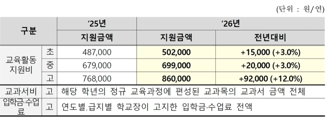 교육급여도 올해보다 조금씩 올라서 초등학생은 1인당 연50만원, 중학생은 70만 원, 고등학생은 86만 원 정도 됩니다. 교과서비, 입학금, 수업료도 전액 지원됩니다.