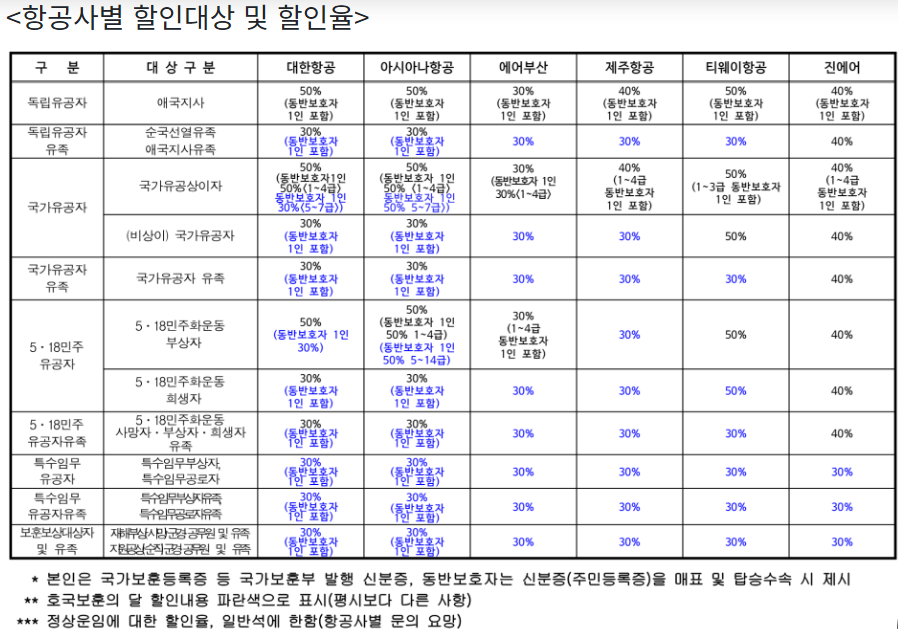 보훈 대상별로 국내선 항공료 30~50% 할인