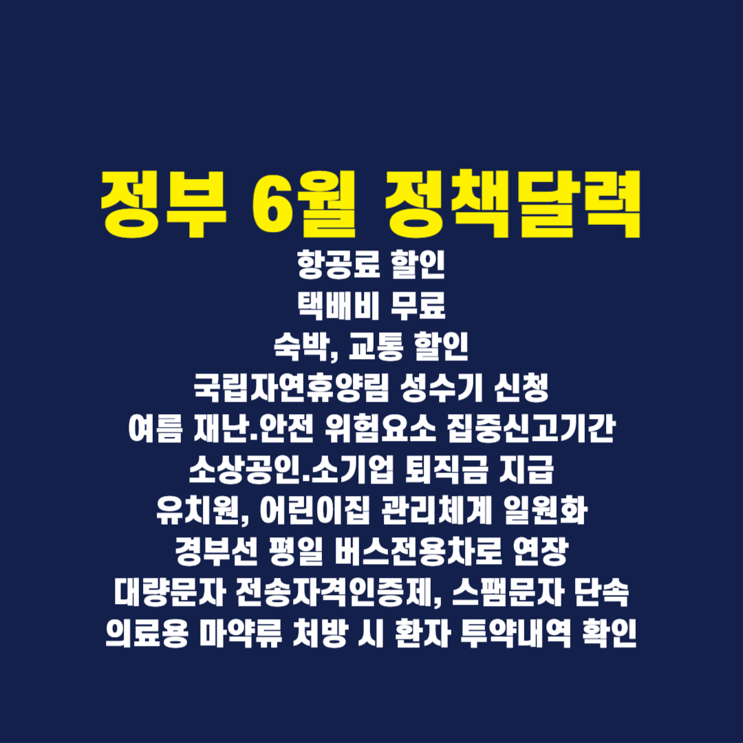 6월 정책달력이 나왔습니다. 모르면 혜택 받을 수 없어 손해 볼 수밖에 없는 분들이 없도록 간단하게 소개하도록 하겠습니다. 챙겨보셨다가 필요한 부분이 있다면 꼭 혜택 받으시길 바랍니다. 안내드릴 내용 간단히 보면 보훈가족 국내여행 할인혜택, 전 국민 여행 할인 혜택, 국립자연휴양림 성수기 신청, 여름 재난. 안전 위험요소 집중 신고기간, 소상공인. 소기업 퇴직금 지급, 유치원 어린이집 관리체계 일원화, 경부선 평일 버스전용차로 연장, 대량문자 전송자격인증제를 통해 스팸문자 단속, 의료용 마약류 처방 시 환자 투약내역 확인까지 간단하게 살펴보겠습니다.