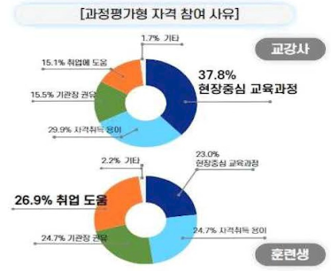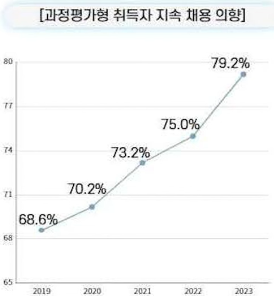 위 2가지 표를 보시면 과정평가형 취득자를 계속 채용할 것인가 조사하였더니 23년에는 79.2%까지 올라갔습니다. 아무래도 일을 배우면서 자격증을 취득하였기때문에 기업의 만족도가 매우 높다는 것을 알 수 있습니다.