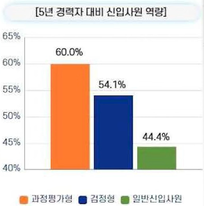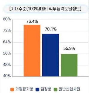 위 표를 보시면 과정평가형이 직무능력도달정도 76.4%로 가장 높습니다. 이 말은 과정평가형이 직무능력도달이 다른 사람들에 비해 매우 빠르다는 뜻입니다. 일반신입은 뽑아서 그때부터 가리켜서 어느 정도 업무능력에 도달하려면 시간과 노력이 그만큼 들어가지만 과정평가형은 확실히 다르다는 조사 결과입니다.