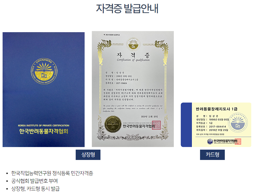 ▶ 지원자격 : 남녀노소 누구나 고졸이상 지원 가능. 단, 동물보호법 위반으로 처벌을 받았거나 특별한 범법 기록이 없으신 분들이 취득 가능합니다.