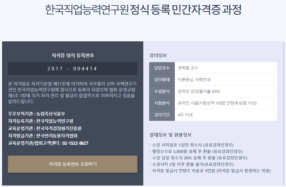 주무부처기관은 농림축산식품부, 자격등록기관은 한국직업능력연구원, 발급기관은 한국반려동물자격협회입니다. 강의기간은 4주 이내이며, 수업방식은 온라인 강의 출석률 60%, 시험방식은 온라인시험이며 60점 이상이면 됩니다.