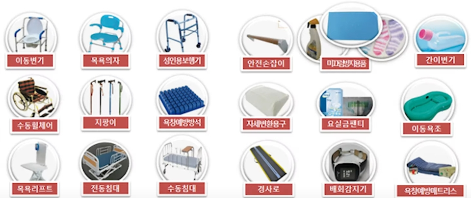 전동침대, 휠체어, 보행기, 지팡이 등 제품들로 구성되어 있습니다. 어르신들이 집에서 지내실 때 더 안전하게 모실 수 있도록 하는 제품들입니다. 이런 제품들을 구매하실 때 정부에서 지원을 받을 수 있지만 모르시는 분들은 본인비용으로 하시는 분들이 많이 계십니다.