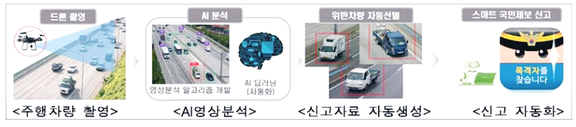 위 드론 단속 과정을 보시면 우선 드론으로 실시간 촬영을 합니다. 촬영분을 AI가 영상을 분석합니다. 인공지능은 자체적으로 차선을 넘거나, 적재물이 제대로 규칙을 지켜 실었는지, 안전벨트를 착용했는지 등을 단속이 가능하며 불법이 감지되었을땐 스마트 국민제보로 자동 신고가 이루어집니다. 도로공사는 과태료와 범칙금을 부과할 수 있는 권한이 없어 이를 자동신고해서 과태료나 범칙금을 청구하게 되는 시스템입니다. 경찰이 직접 단속한다면 실제로 적발되는 건수는 제한적이 될 수밖에 없기 때문에 드론 한대로 많은 차량을 동시에 감시하고 촬영해서 분석하여 단속할 수 있는 것이 훨씬 효율적입니다. 장소가 어디든 상관없이 위에서 단속하기 때문에 여러 가지를 단번에 단속할 수 있는 효과를 보고 있는 것입니다.