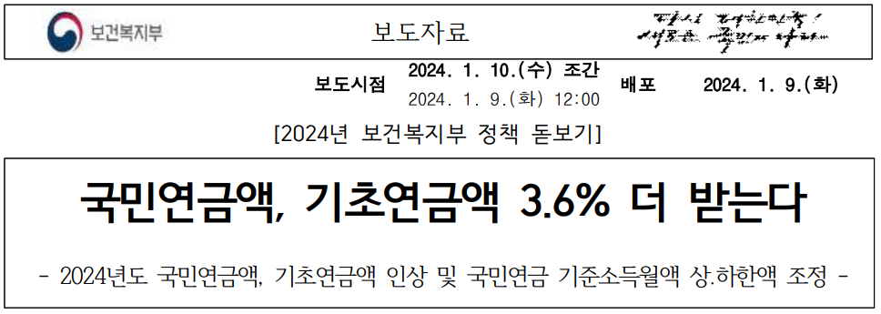 1월 발표했던 자료를 좀 더 살펴보면 국민연금, 기초연금 계산하는 방식이 복잡합니다만 궁금하신 분들은 보도자료 다운받아서 전체 한 번 읽어보시는 것이 좋을 것 같습니다. 1월에 발표했던 보도자료의 결론은 기초연금 기준연금액 역시 기초연금법에 따라 전년도 소비자물가 상승률 3.6%를 반영하여, 2023년 32만 3,180원에서 33만 4,810원으로 늘어납니다. 올해 기초연금을 받는 약 701만 명의 어르신들은 1월부터 인상된 기초연금액을 지급받게 되며, 보건복지부는 기초연금 기준연금액의 인상을 내용으로 하는 고시를 1월 중 개정할 계획입니다.