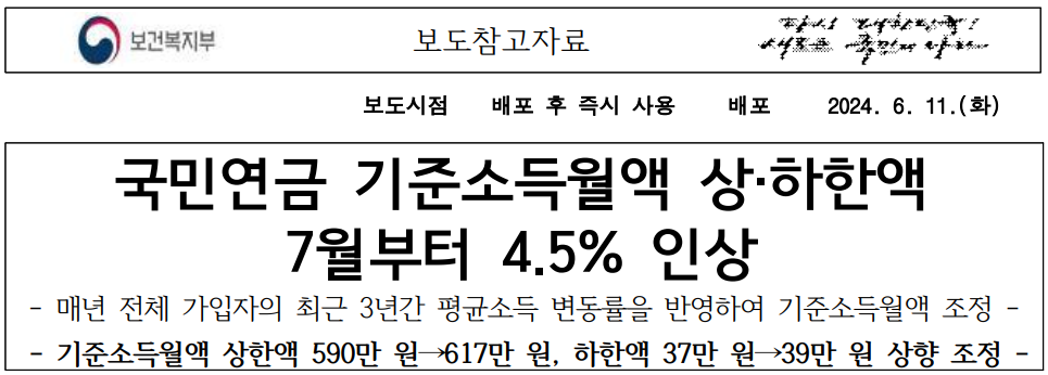 7월 1일부터 국민연금 보험료의 산정 기준인 기준소득월액 상한액이 590만 원에서 617만 원으로, 하한액은 37만 원에서 39만 원으로 상향 조정된다고 밝혔습니다. 2024년도 기준소득월액의 조정으로 국민연금 최고 보험료는 전년보다 2만 4,300원이 인상된 55만 5,300원이 되고, 최저 보험료는 전년보다 1,800원이 인상된 3만 5,100원이 됩니다.